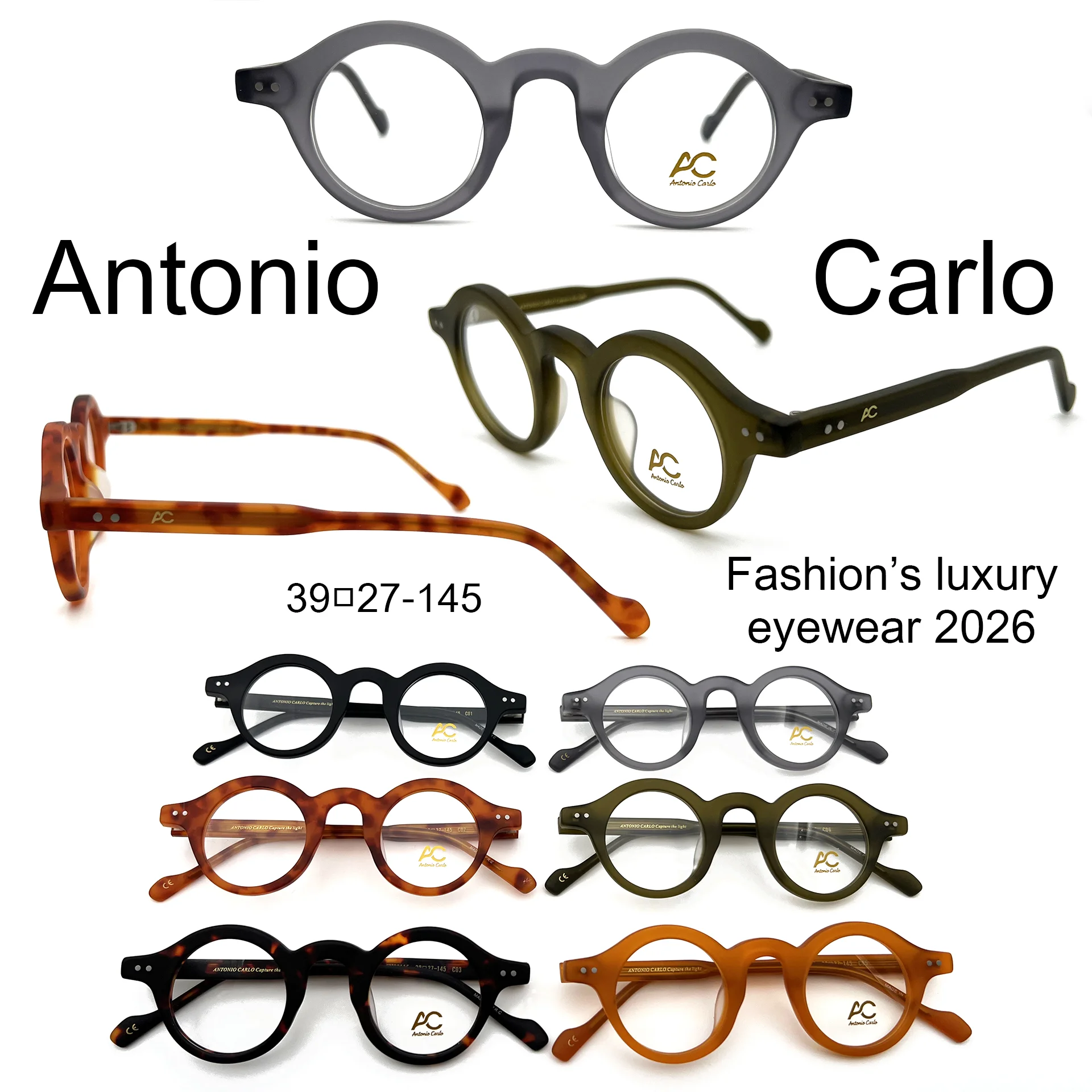 عینک طبی آنتونیو کارلو با فریم گرد و رنگ‌های جذاب مشکی، طوسی، پلنگی و مشکی-پلنگی، قهوه ای و زیتونی طراحی شیک و راحتی بی‌نظیر را برای استفاده روزمره ارائه می‌دهد.